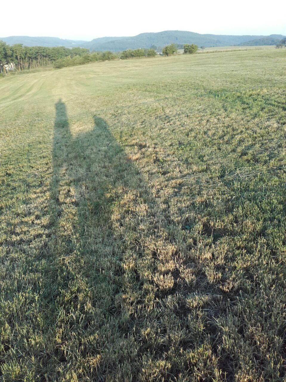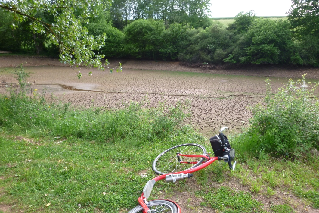 Dann lange bergauf über einen zum Glück schön gemähten Wiesenweg an einem ausgetrockneten Weiher vorbei.