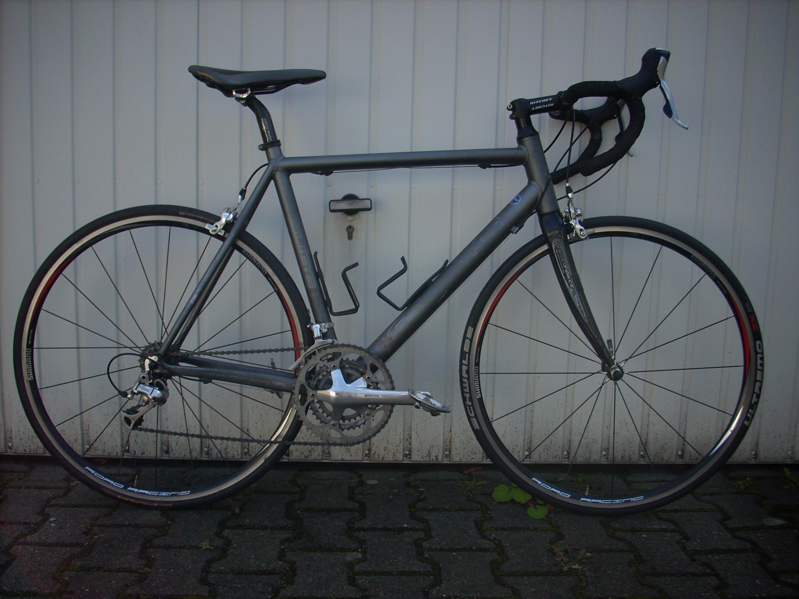 und ein solides Upgrade zu meinem alten, zu großen Stahlrenner: komplett Ultegra, endlich keine Rahmenschaltung mehr, leichter als 11kg Stahl, passender Rahmen, mehr als 12 Gänge... Optisch ist der Rahmen etwas mitgenommen, die Beschriftung ist unleserlich geworden. Jetzt ist die Frage, ob ich den Rahmen neu lackieren lasse oder auf die Beschriftung verzichte. Bei Letzterem müsste ich die Reste der Schrift noch irgendwie ab bekommen; ich weiß gerade aber nicht, was ich besser finde.