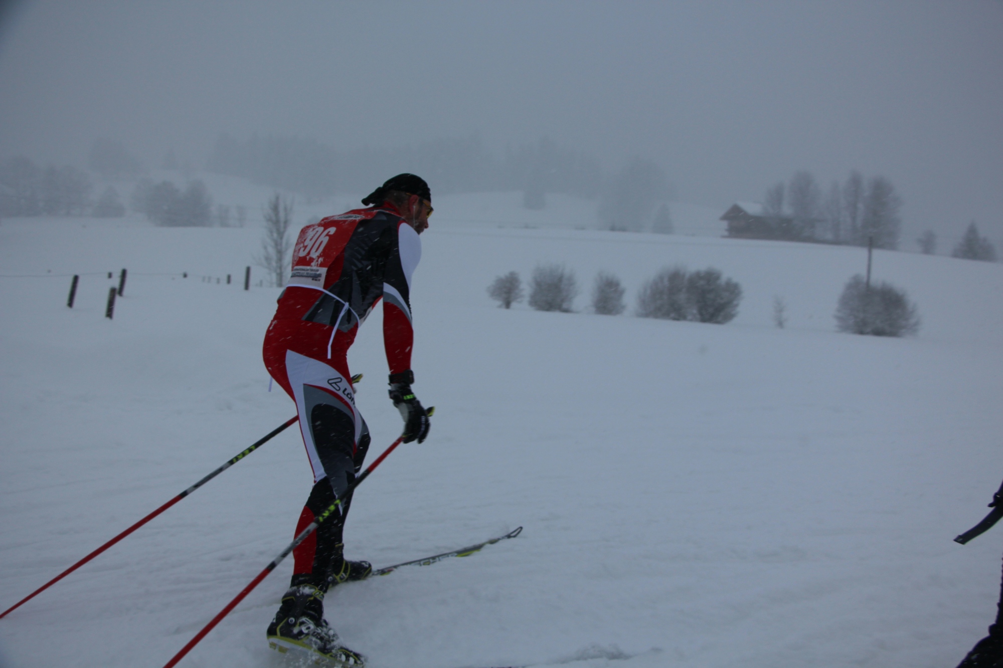 Der angekündigte Schneefall kam nicht am Mittag sondern war schon vor dem Frühstück da. Beim Einlaufen trotz Brille fast keine Kontraste zu sehen, vor dem Start wurde die 2te Absperrung geöffnet, wodurch auf eine ohnehin zu weiche und danach auch noch zu enge Strecke viel zu viele Starter gleichzeitig losgeschickt wurden. Resultat beim ersten Hügelchen 5x anhalten, danach im Gänsemarsch weiter und bei den Abfahrten Schneepflug, um niemanden über den Haufen zu fahren.