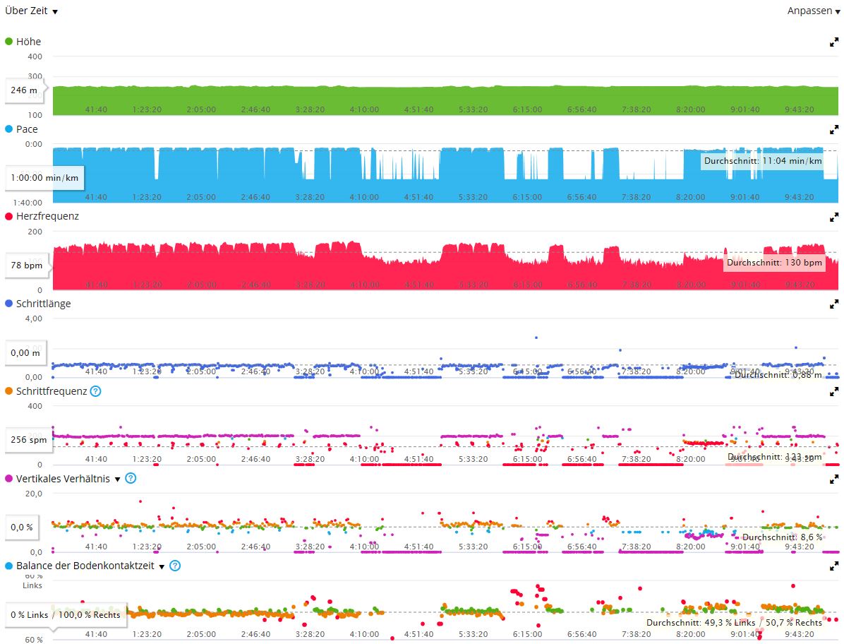 | kleines Bergtraining (13 Runden Scherbelberg) EL @5:48min/km / 13*700m @6:17 <-> 6:47 / AL @5:42 min/km Ø Hf in den IV bei 152 Bpm, die maximale Hf heute bei 171 Bpm (89%) |