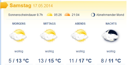 14:00-17:00 Uhr: wolkig, 14° C, rel. Luftfeuchtigkeit 54 %