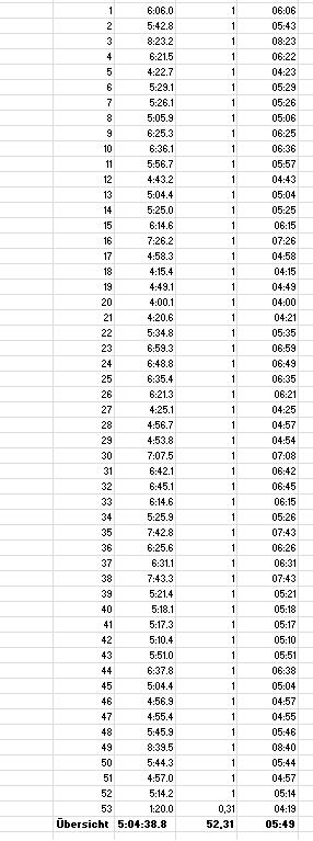 ich hatte 52,5 km und schon so ab km 25 immer einen km mehr auf der Uhr als auf den Schildern. Philipp, km 20 war eine Rennstrecke vor der Zeitmessmatte, den hab sogar ich mit 5:13 :) da haben wirs richtig laufen lassen....