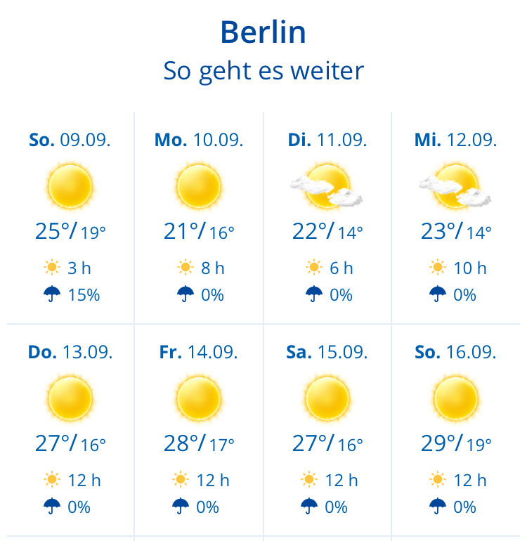 AccuWeather sieht für den 16.9. im Mom. 10°/18° und reichlich Sonnenschein vor. Ich würde mich also dann für diese Prognose entscheiden wollen. :D