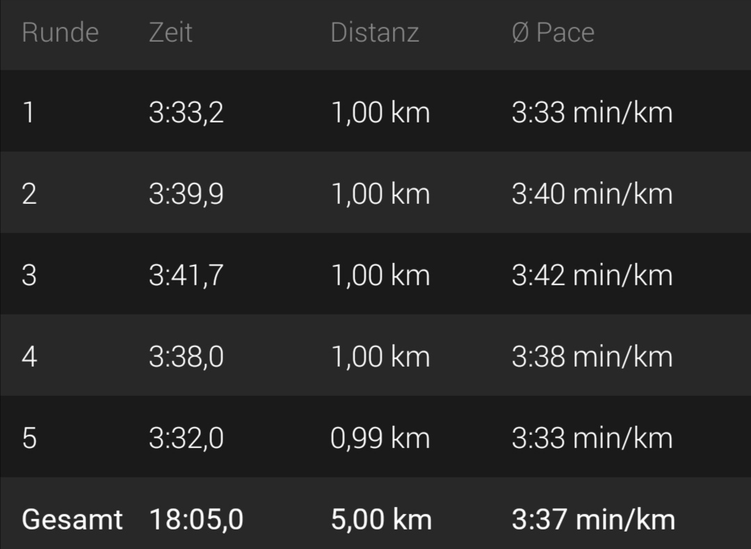 ich bin soeben im Olypark MUC gelaufen, gute Bedingungen, hat richtig viel Freude gemacht. Mit der Zeit - 19:07 - bin ich nicht ganz zufrieden, der erste KM in 3:35 min war einfach zu schnell und ab KM 4 hat der Lauf schön reingebissen (was okay ist) und die Körner waren weg (was nicht okay ist) und am Ende konnte ich nimmer draufpacken.