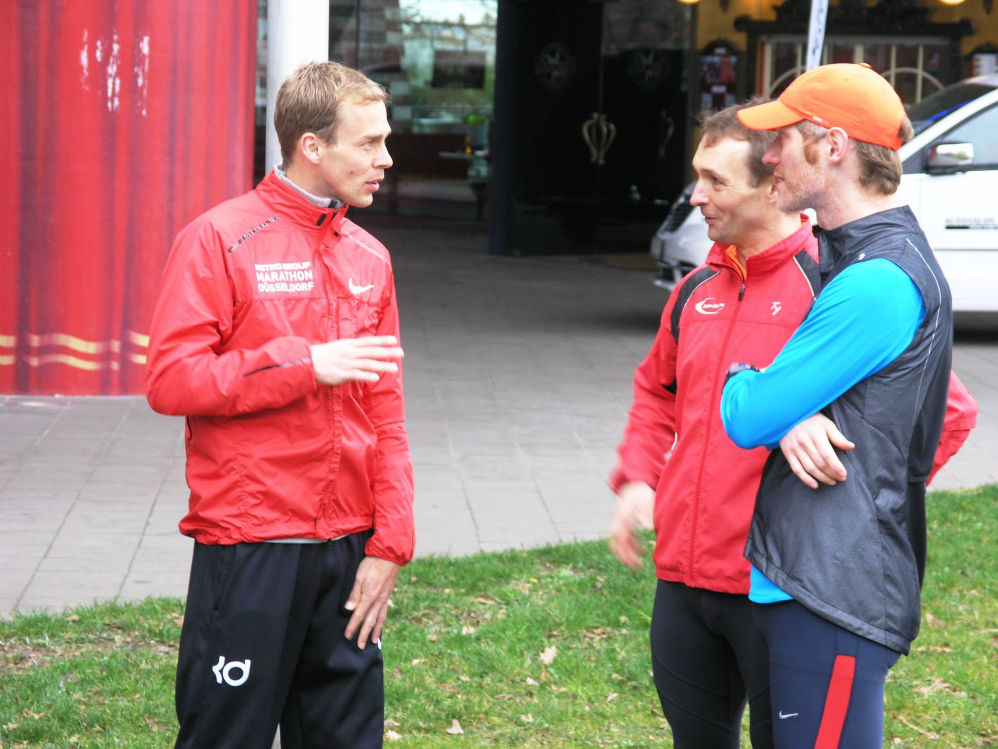 nett war's. Obwohl ich in diesem Tempo eigentlich sehr sicher bin war ich vor dem Läufchen sehr unsicher. Wie mir ging es wohl noch einigen anderen denn Andre meinte es hätten sich 6 oder 7 Leute angemeldet von denen jedoch nur ich die Halbe Strecke laufen mag. Gekommen ist dann außer mir niemand. Andre hatte noch Nikki Johnstone dabei (versucht 2:31 in Edinburgh zu laufen) und ich habe zum Glück noch vor dem Start Heiko Schmittipaldi getroffen. Da er heimisch ist in DDorf machte er mir direkt Mut daß wir nicht mit dem Shuttle zurück fahren müssen, er kenne sich schließlich aus.
