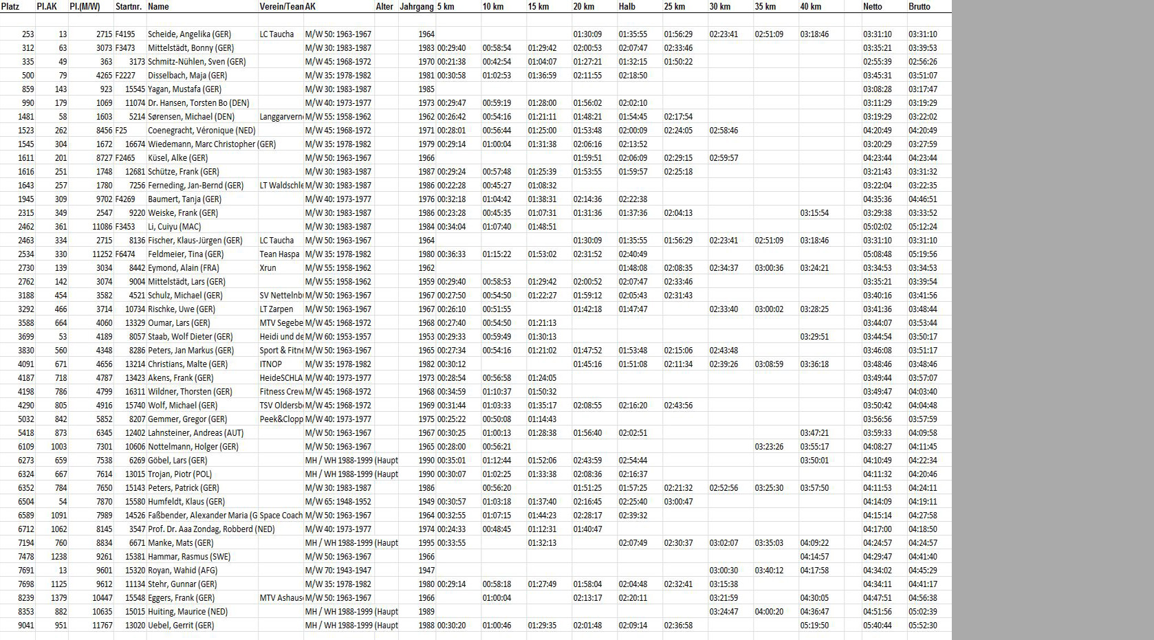 | Platz | Pl.AK | Pl.(M/W) | Startnr. | Name | Verein/Team | AK | Alter | Jahrgang | 5 km | 10 km | 15 km | 20 km | Halb | 25 km | 30 km | 35 km | 40 km | Netto | Brutto | |