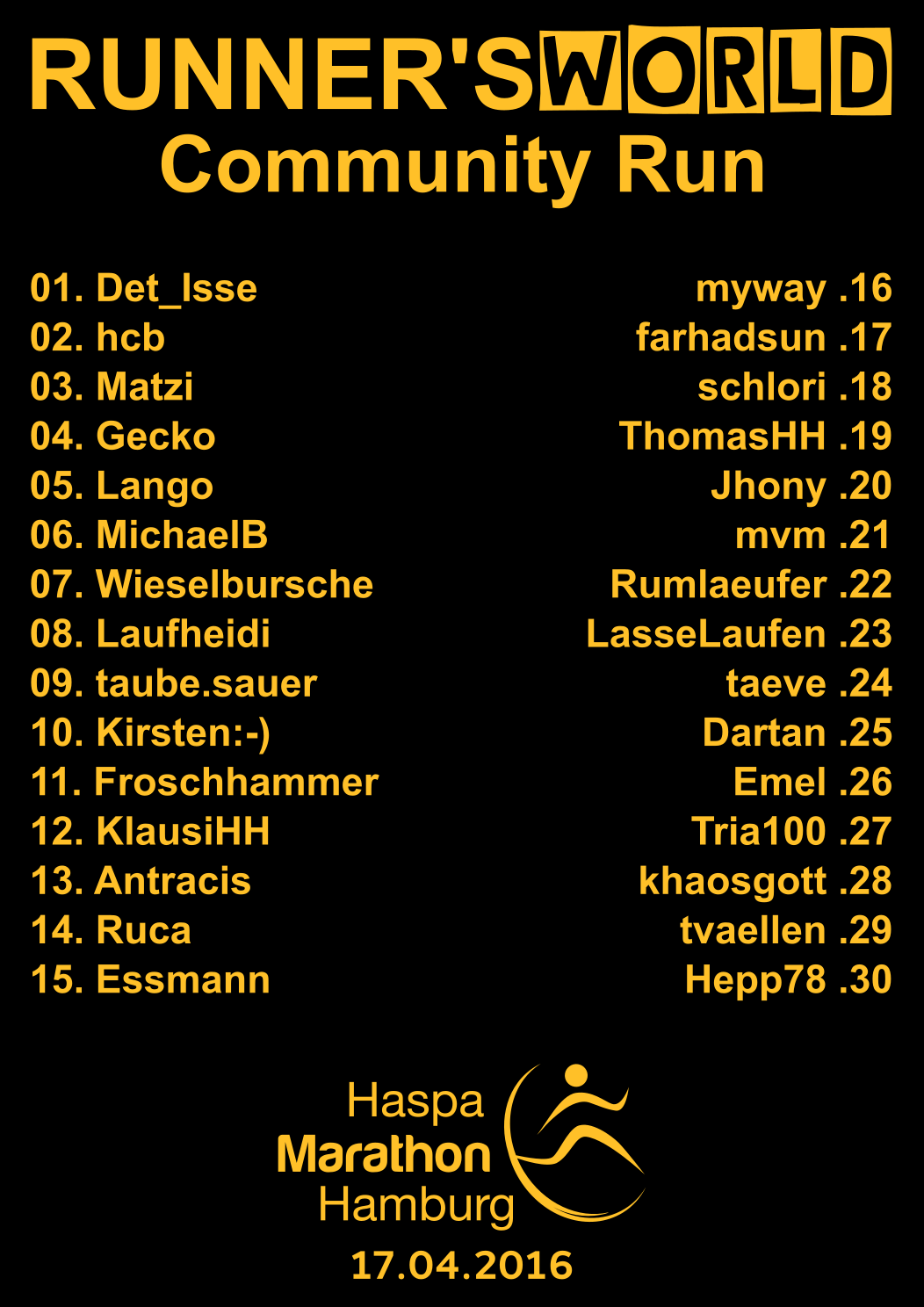 Kurzum: Ich werde in Hamburg keinen Marathon laufen (vielleicht laufe ich die ersten 20km oder so mit, falls mein Bruder mit dabei ist). Gecko, Du kannst meinen Namen daher vom Shirt runternehmen. Sollte schon eine Bestellung getätigt sein oder der errechnete Preis (auch) in irgendeiner Weise auf meiner Zusage, ein Shirt abzunehmen, basieren, lasse ich mich aber natürlich an meiner Zusage festhalten.
